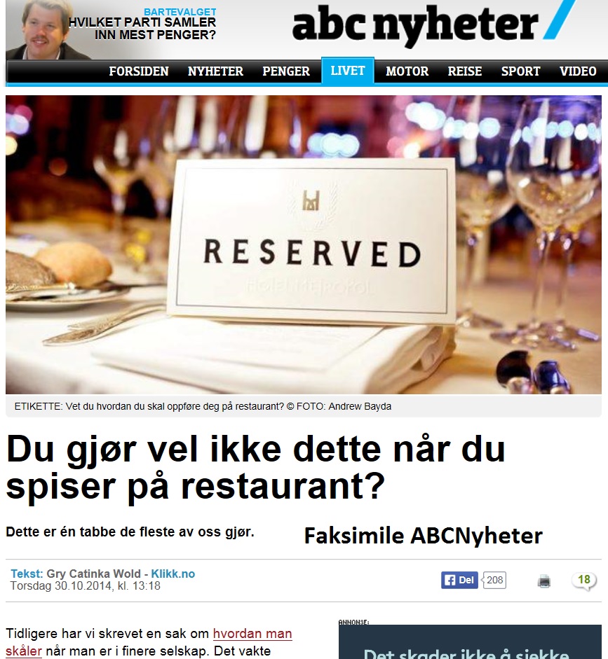 november 25, 2014november 25, 2014 Restaurantetikette Trykk lenken til hele artikkelen her ABCNyheter – skikk og bruk på restaurant med Reidar Helliesen Det finnes noen takt og tone regler man bør være observant på når man besøker restauranter. Del dette: Klikk for å skrive ut(åpnes i en ny fane) Skriv ut Klikk for å sende en lenke med e-post til en venn(åpnes i en ny fane) E-post Klikk for å dele på Facebook(åpnes i en ny fane) Facebook Klikk for å dele på X(åpnes i en ny fane) X Klikk for å dele på LinkedIn(åpnes i en ny fane) LinkedIn Lik Laster inn... Relatert