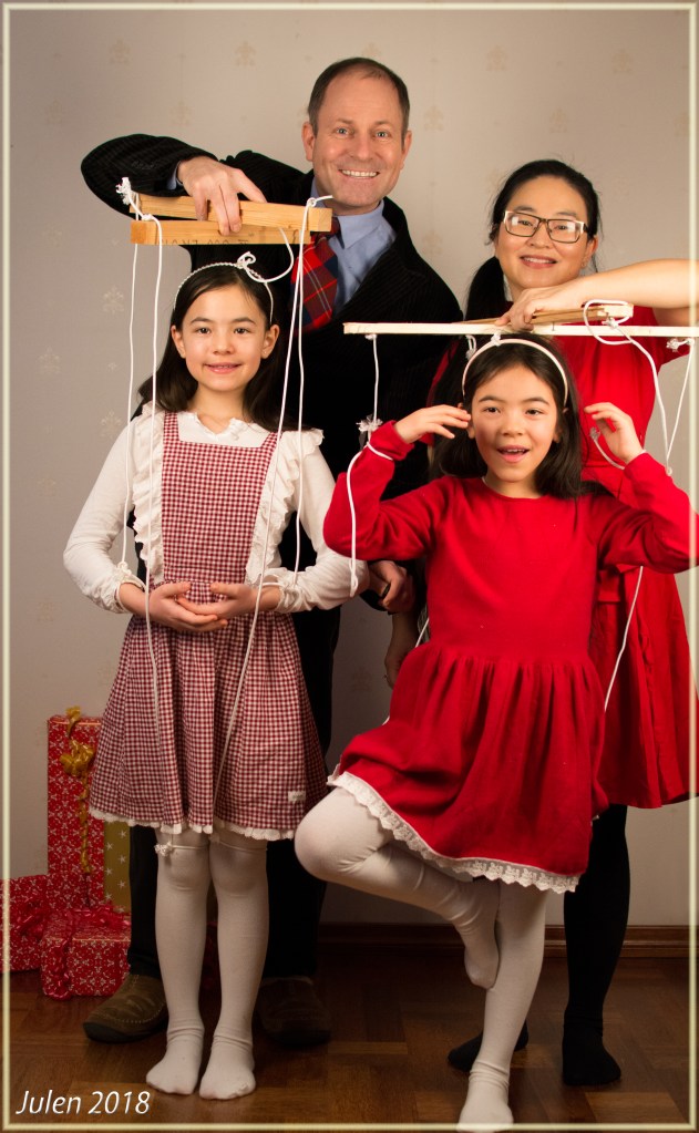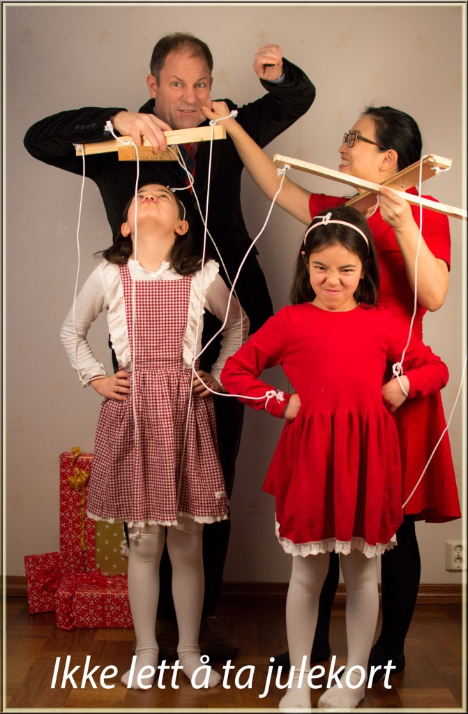 I dag rigget vi oss klar for å ta julekort. I siste liten som vanlig. Marionettene våre ble årets tema. Som foreldre skal man oppdra barnene og styre dem i riktig retning. Det er ikke enkelt. Noen ganger tenker vi at de styrer oss mer enn vi styrer dem. Vi falt for valget hvordan oppdragelsen bør være, ikke hundre prosent hvordan den fungerer i virkeligheten.
